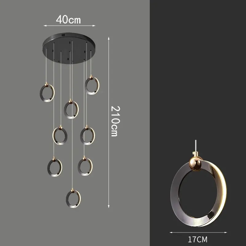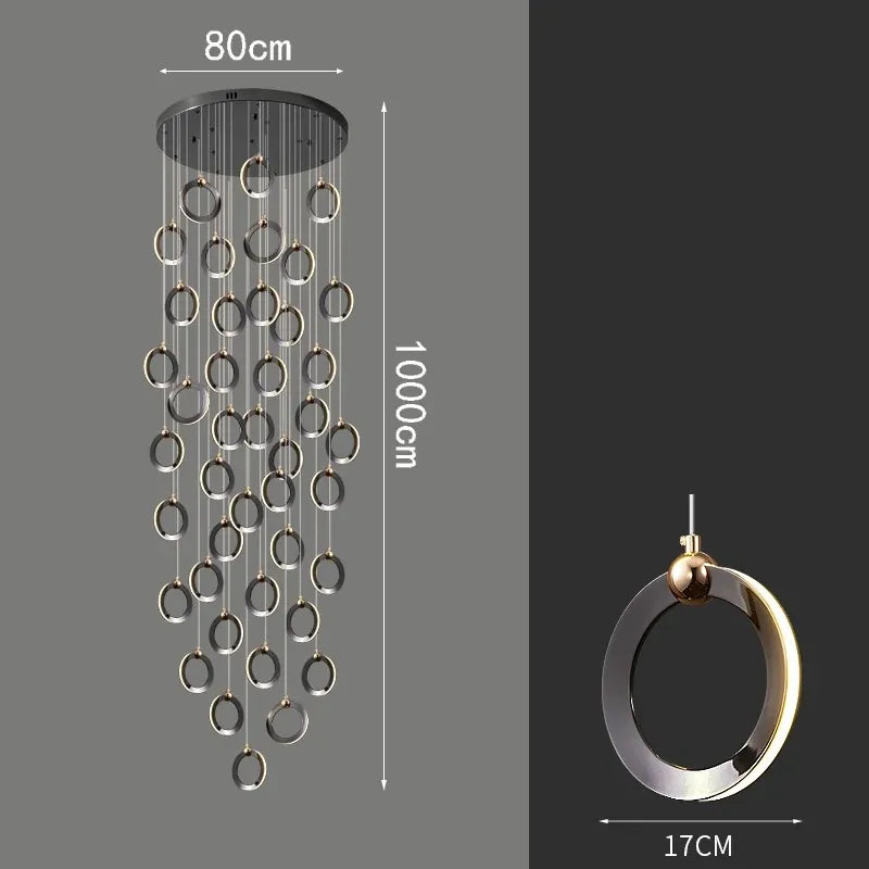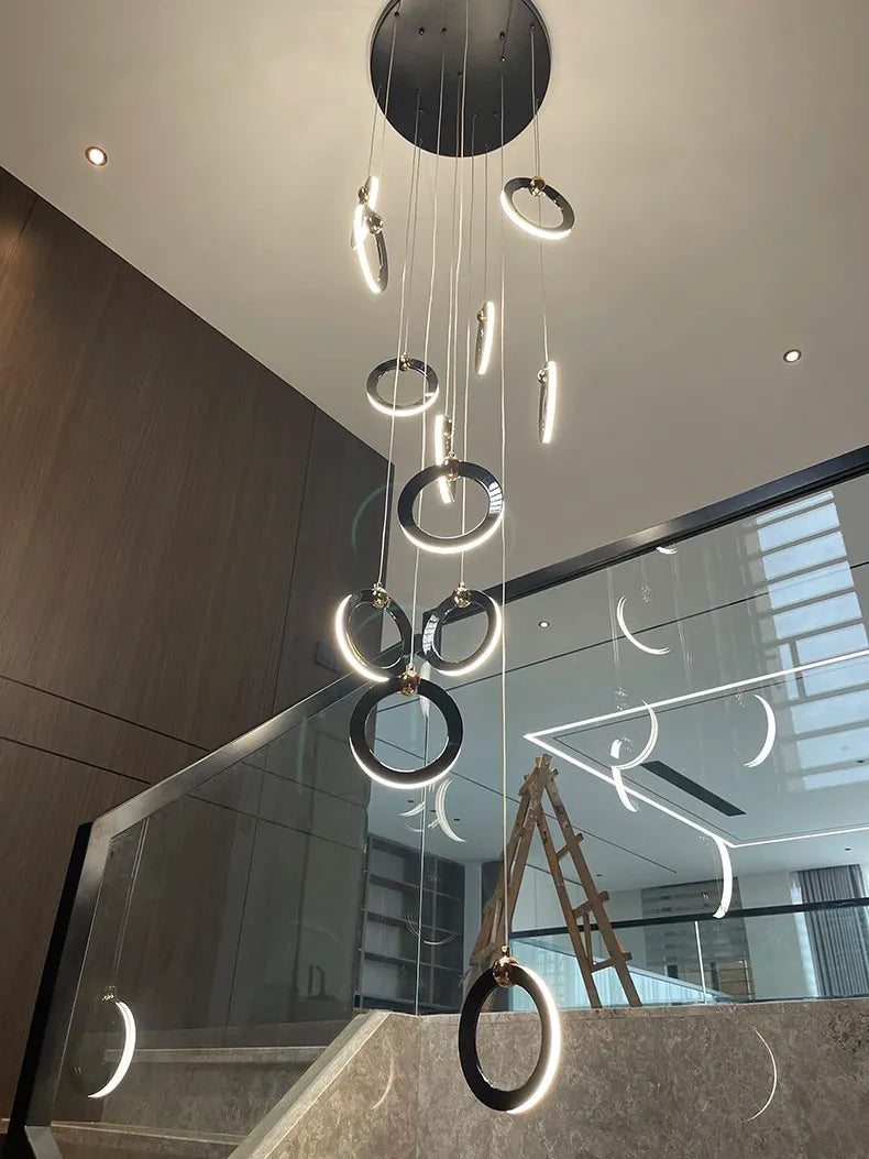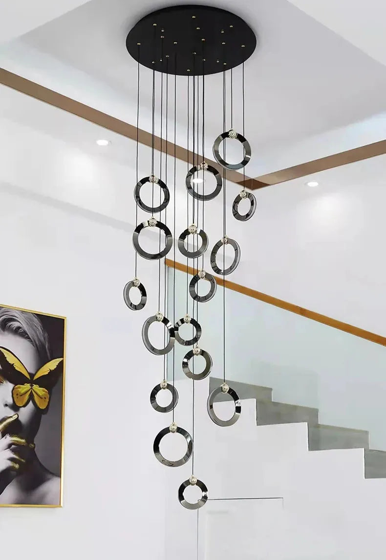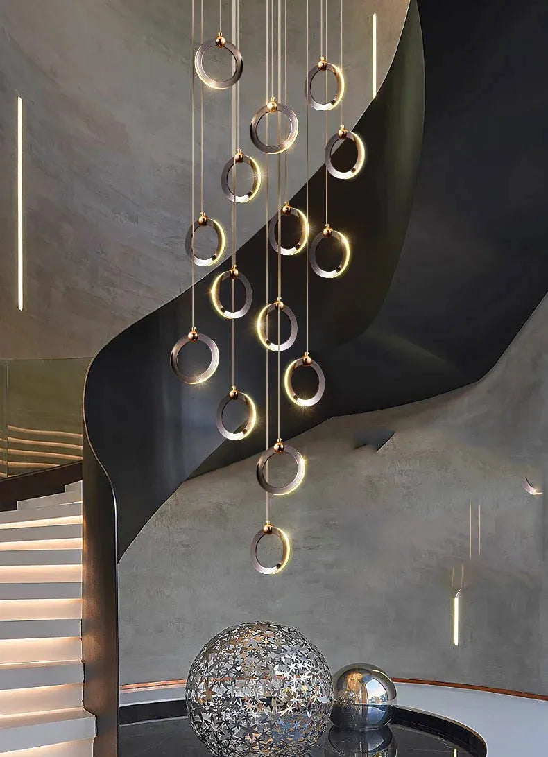 Precio regular $ 9,850.00El candelabro Perla Negra deslumbra con su diseño contemporáneo de aros suspendidos en elegante acabado oscuro y detalles dorados. Ideal para escaleras, recibidores o espacios de doble altura, aporta sofisticación y un toque artístico, iluminando el ambiente con estilo y modernidad. Calidad premium y envío gratis en todo México.