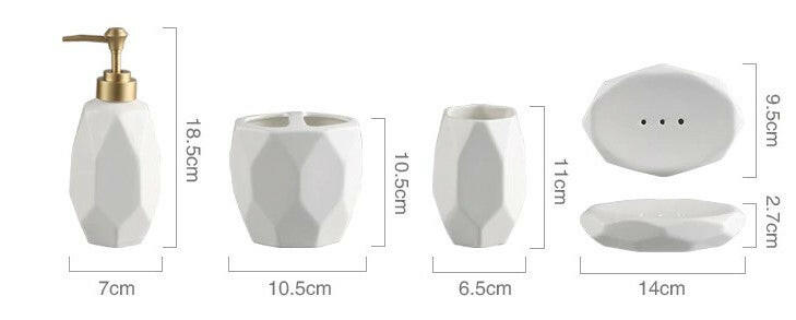 Mouth cup X2, toothbrush cup X1, soap bottle X1, soap dish X1
